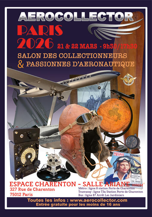 Dear Exhibitors,We are pleased to invite you to the AEROCOLLECTOR which will be held:In Paris 12 district - Espace Charenton - Ariane Hall. Saturday 21th and sunday 22th March 2026More than 1000 M2 of exhibition await you for, an entire weekend in a recent space that offers all the advantages (functional installations, sound system, Wi-Fi, high quality lighting, air conditioning and food/coffee point). In addition, its geographical location, at the gates of Paris, (Metros, Bus, Tramway) will allow an easy access to the show for visitors. It will be an opportunity to meet other collectors during a festive weekend and to share our passion for Aeronautics!